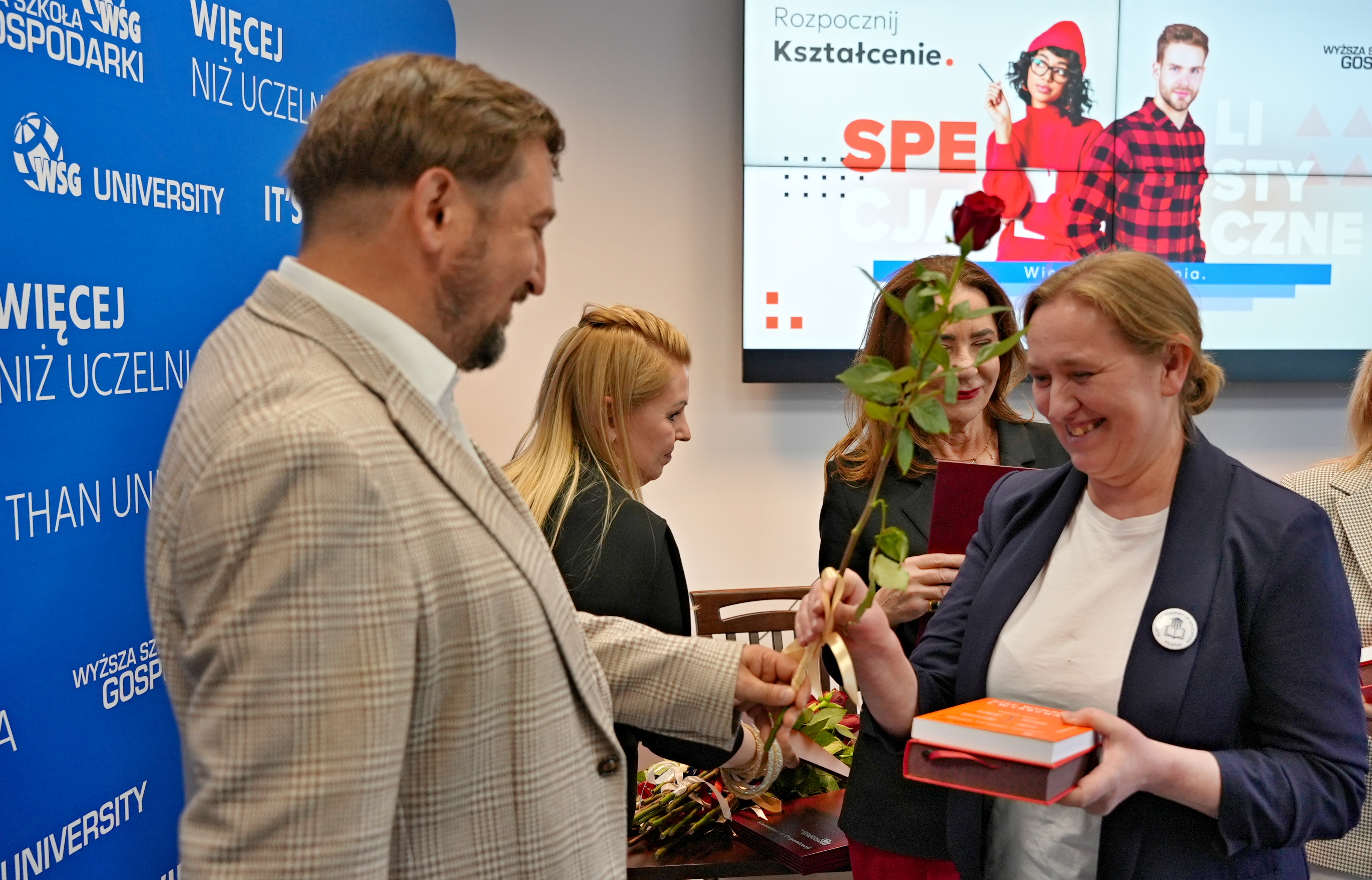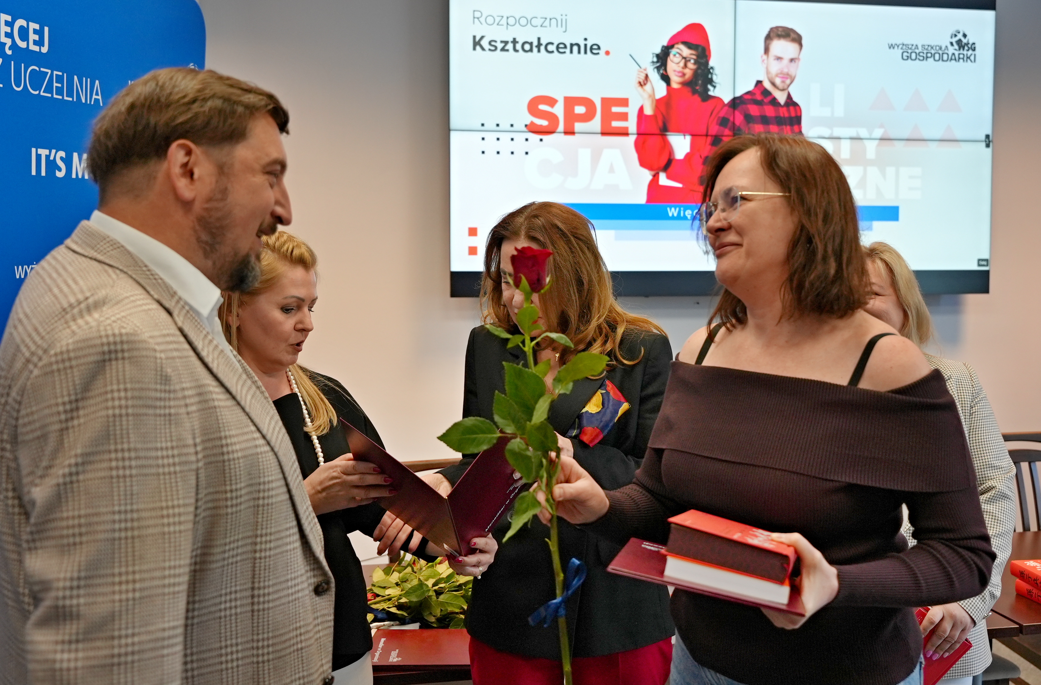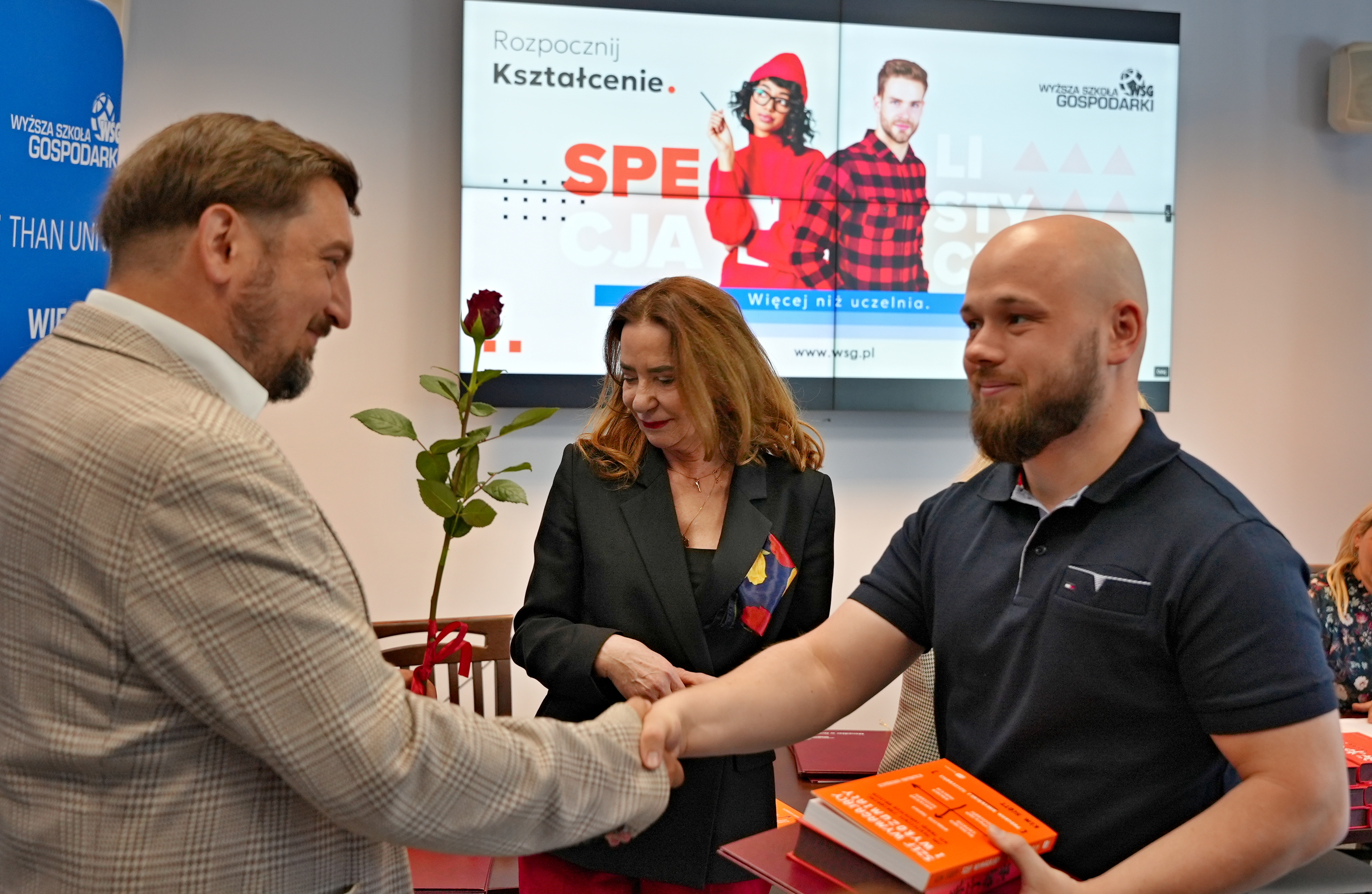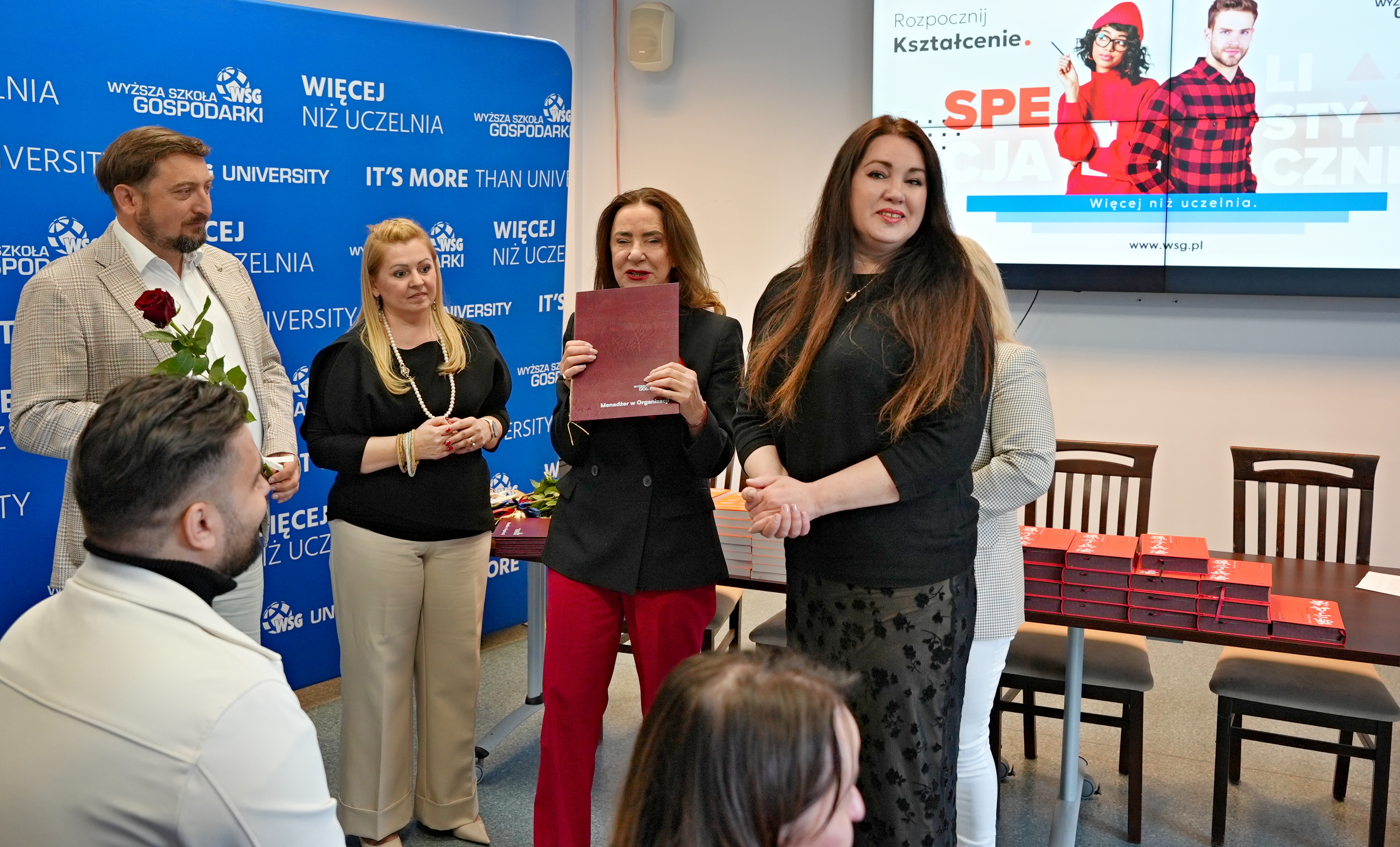 W uroczystości wzięli udział przedstawiciele władz Uczelni: Kanclerz WSG doc. Filip Sikora, Prorektorka ds. Rozwoju i Filii doc. inż. Agnieszka Walczak-Beszczynska oraz Dziekan Kolegium Nauk Społecznych prof. WSG dr Grażyna Sipińska. W swoim wystąpieniu Kanclerz podkreślił szczególne znaczenie kształcenia na poziomie PRK 5, zwracając uwagę, że jest to obszar wciąż zbyt słabo rozpropagowany w Polsce, a jednocześnie niezwykle istotny z punktu widzenia rynku pracy i rozwoju kompetencji zawodowych.Dziekan Kolegium Nauk Społecznych prof. WSG dr Grażyna Sipińska podzieliła się refleksjami na temat współpracy ze słuchaczami, podkreślając, że spotkania w trakcie kształcenia były dla niej bardzo inspirujące i stanowiły cenne źródło wymiany doświadczeń.